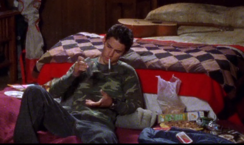 When Luke goes to tell Broody that they’re going to go to Lorelai’s for dinner, he’s sitting on his inflatable bed surrounded by the most stereotypical “bad teen” shit. Apparently Broody is a “bad teen” from a 1950s greaser movie. All he needs now is a switch blade and a leather jacket.