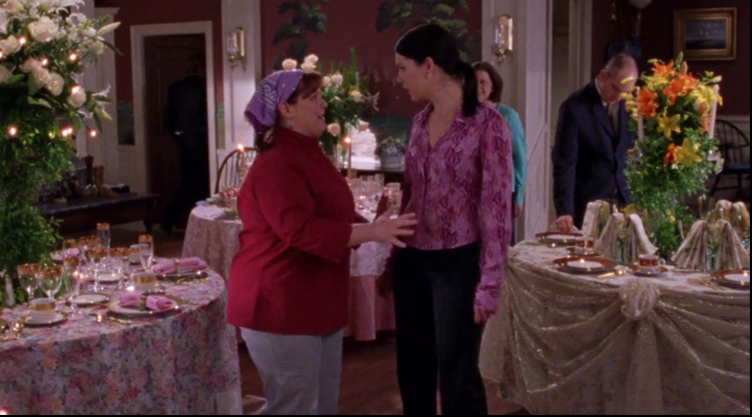 Judgy WASP Mom comes to the diner and yells at Lorelai for taking Sookie’s wedding away because she is a Wedding Vampire who will have to find another source of taffeta. Then the conversation takes a hard turn into “YOU LOVE LUKE” town. She (ACCURATELY) insists that Lorelai loves Luke. Because she does. Because they belong together and should have all the sex. NOW KISS!