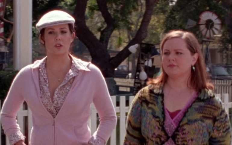 In the next scene, Lorelai complains to Sookie about how Discount Braff ignored her during the meeting. Basically, he acted like a professional and didn’t show any favoritism to her and that, to Lorelai, is AWFUL. However, who can hear them over the sound of these outfits: