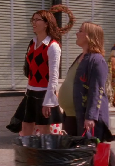 The next day, Lorelai (wearing a Harley Quinn sweater vest) interviews a designer at Luke’s.